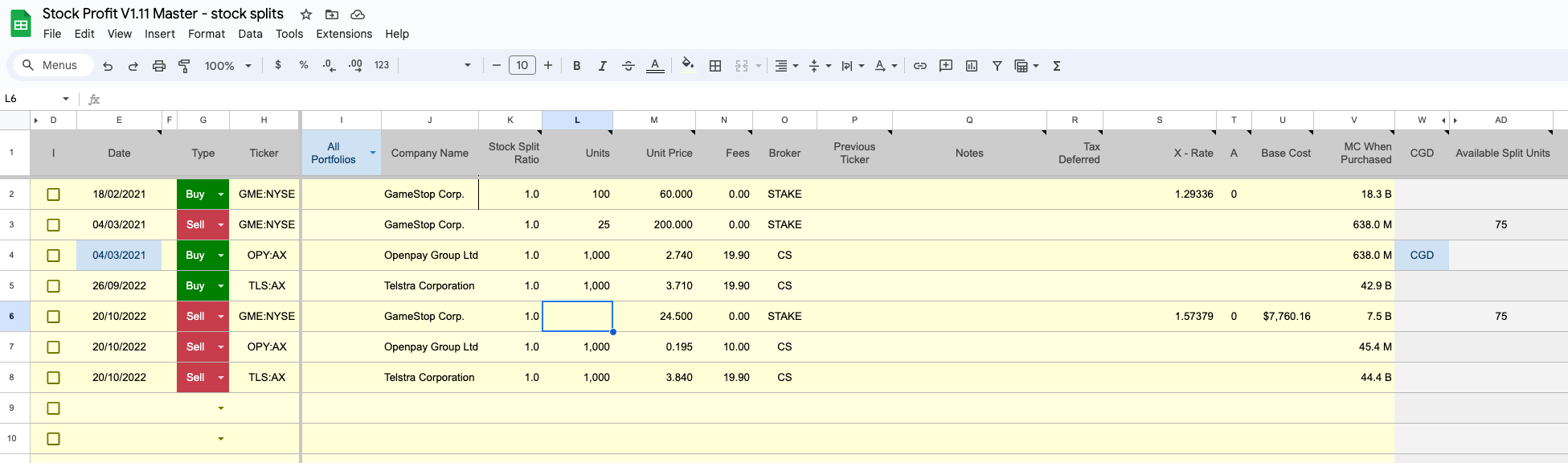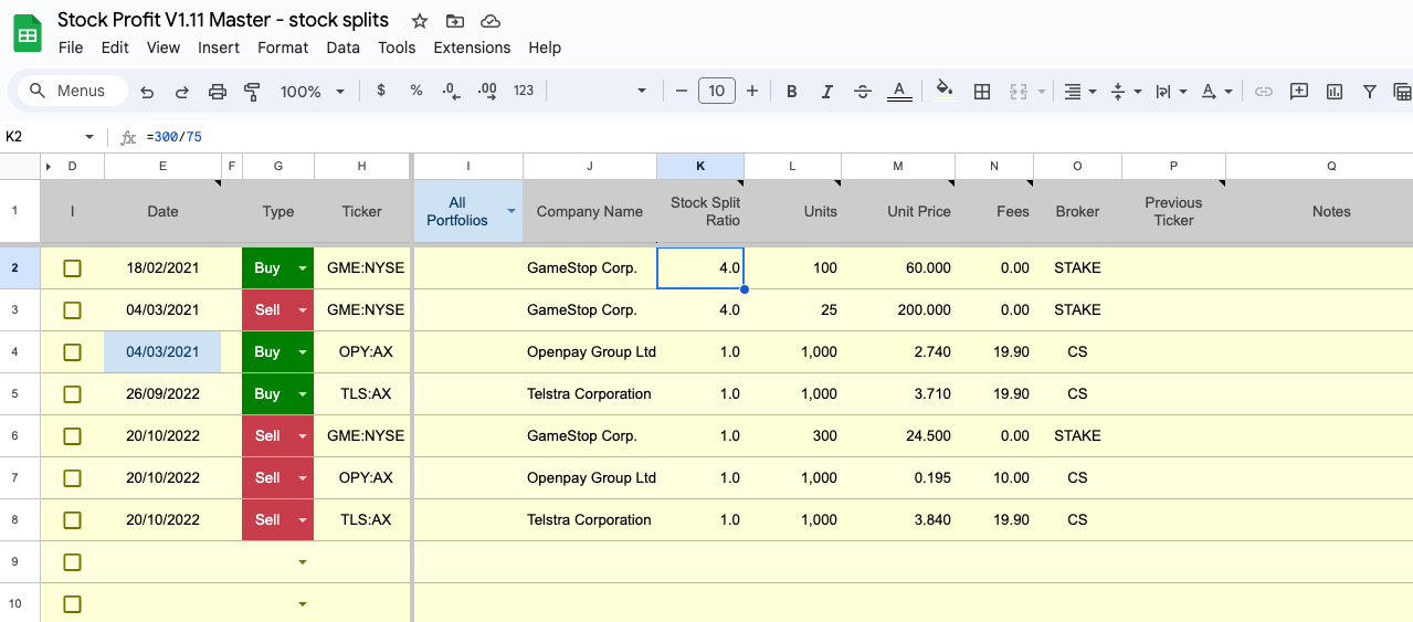 - Put this formula in all Buy and Sell transactions prior the stock split date of 2022-07-21